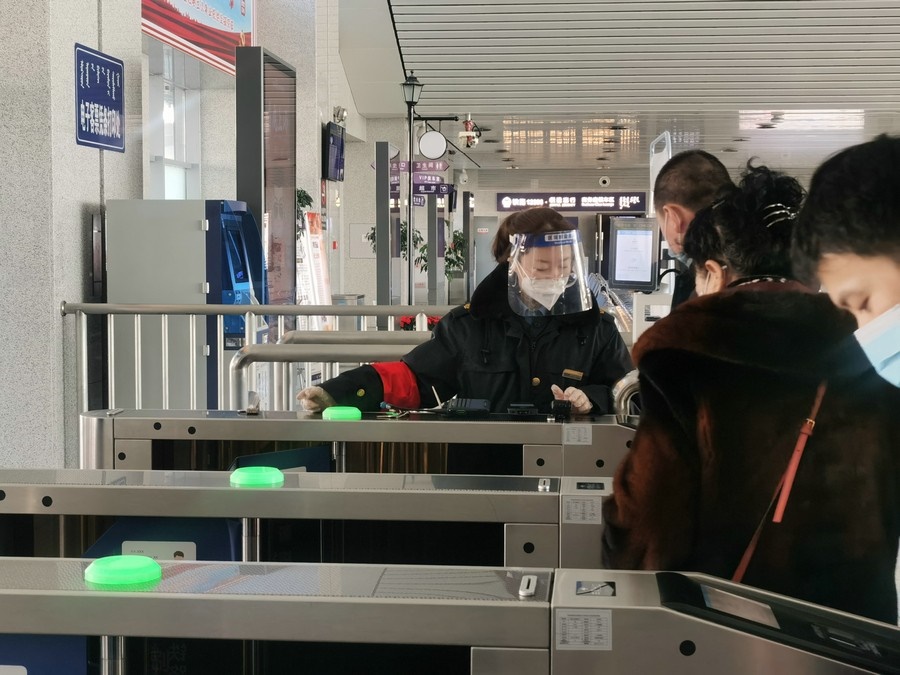 1月17日,春運首日,集寧站烏蘭察布站客運人員組織旅客通過閘機(jī)有序檢票進(jìn)站。