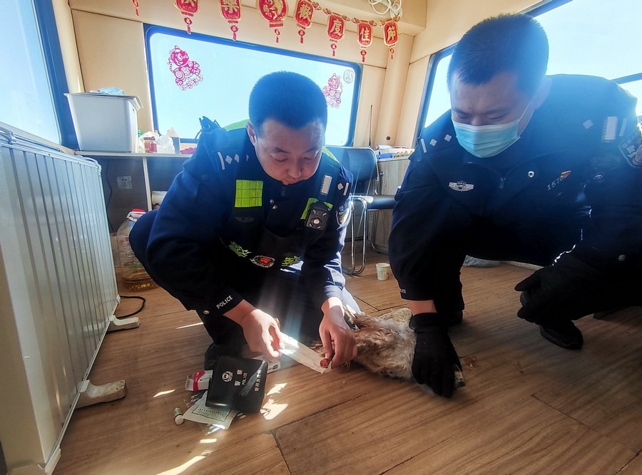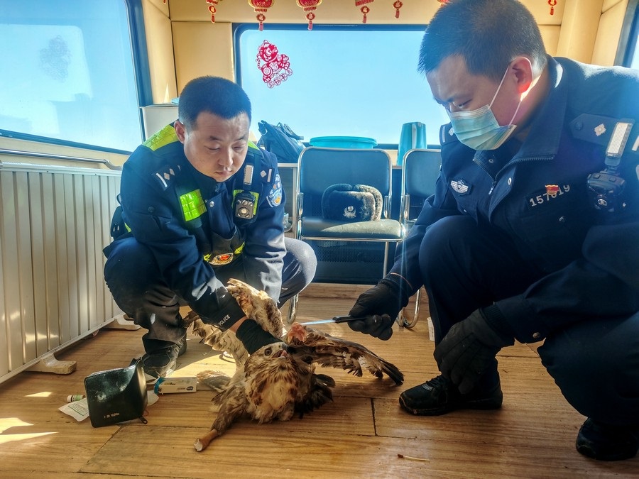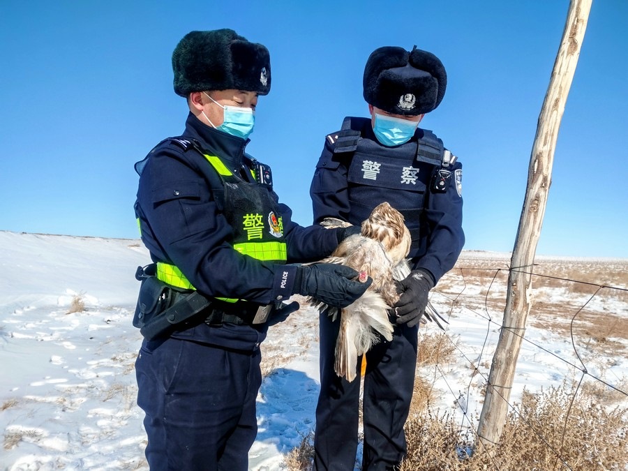 北疆新聞網(wǎng)、北疆新聞APP、北疆云消息(記者 劉嬙 通訊員 張路 張冬)2月10日,內(nèi)蒙古烏蘭察布市四子王旗腦木更邊境派出所民警在執(zhí)勤巡邏途中,發(fā)現(xiàn)一只“大鳥”被困在網(wǎng)圍欄上。民警靠近后仔細(xì)觀察發(fā)現(xiàn),這只“大鳥”在奮力撲打翅膀但無法飛行,右爪缺失,受傷嚴(yán)重。民警通過手機搜索網(wǎng)絡(luò)圖片比對,初步判定為國家二級保護動物鷹隼。