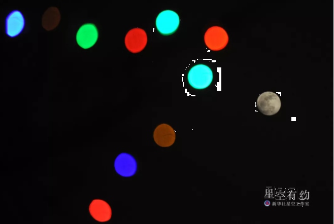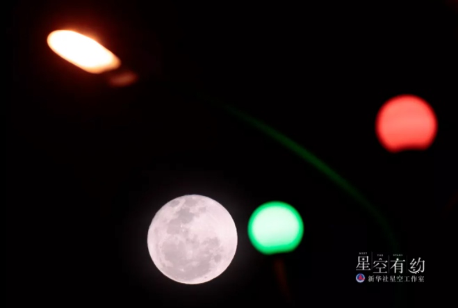 這是2013年2月24日元宵節(jié),北京夜空的月亮與五彩繽紛的燈飾相映成輝。這一年的元宵月是“十七圓”。(新華社記者何俊昌攝)