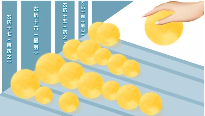 統(tǒng)計發(fā)現(xiàn),“滿月”出現(xiàn)次數最多的是農歷十六,其次是農歷十五,再次是農歷十七,最少的是農歷十四。