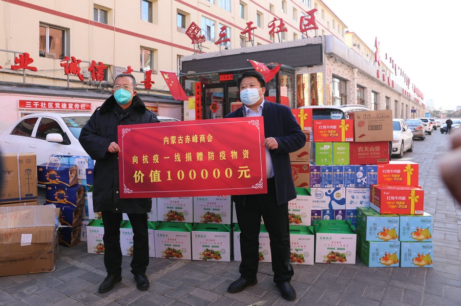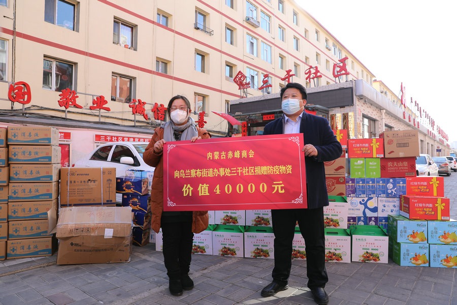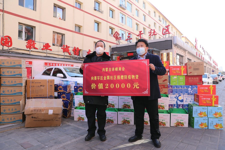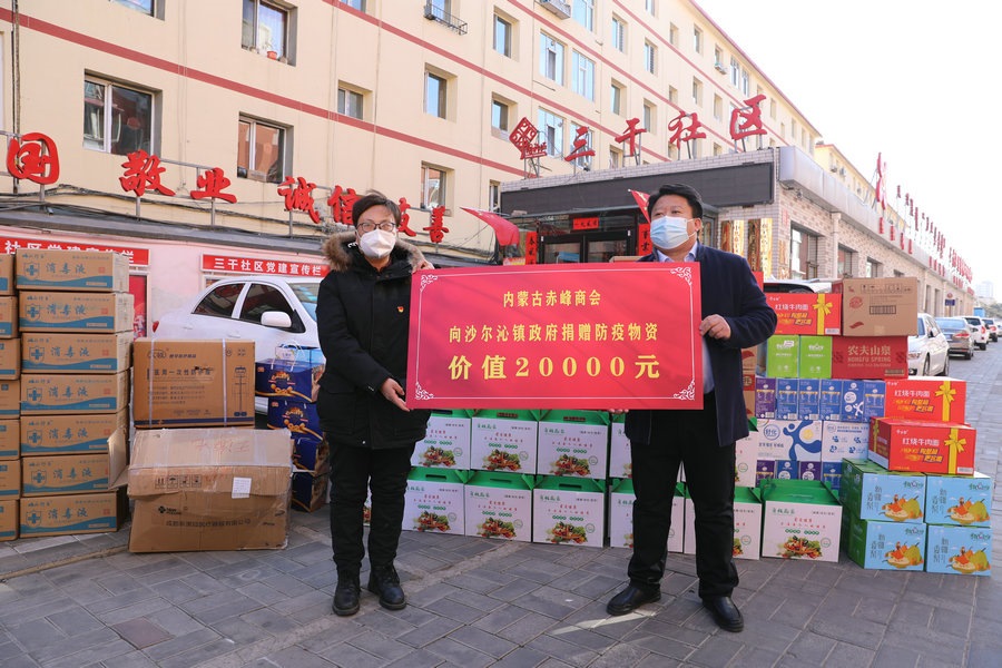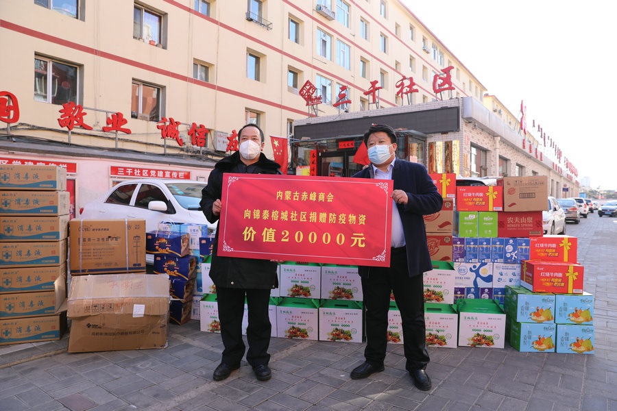 自疫情發(fā)生以來,內(nèi)蒙古赤峰商會(huì)慰問了呼和浩特市公安局賽罕區(qū)分局昭烏達(dá)路派出所,向抗疫一線公安民警表達(dá)慰問,并為他們送去第一批價(jià)值1萬元的抗疫物資;商會(huì)執(zhí)行會(huì)長張學(xué)春向新城區(qū)城市管理局捐贈(zèng)5萬元防疫物資,用于一線疫情防控;商會(huì)副會(huì)長單位內(nèi)蒙古乾碩防水工程有限公司分別向呼和浩特市4個(gè)社區(qū)2個(gè)衛(wèi)生院捐贈(zèng)了價(jià)值10萬元的防疫物資及生活必需品;商會(huì)聯(lián)合副秘書長單位蒙影影業(yè),走進(jìn)玉泉區(qū)清泉街社區(qū),慰問抗疫一線工作人員,并為他們送去價(jià)值5000元的生活物資;商會(huì)聯(lián)合副會(huì)長單位友鵬實(shí)業(yè)集團(tuán),向回民區(qū)大慶路小學(xué)、伊利健康谷、東庫街社區(qū)、呼和浩特職業(yè)學(xué)院等防控一線捐贈(zèng)價(jià)值10萬元的防疫物資。