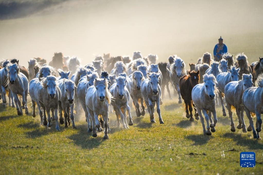 5月17日,錫林郭勒盟西烏珠穆沁旗的牧民在夕陽下馴馬。