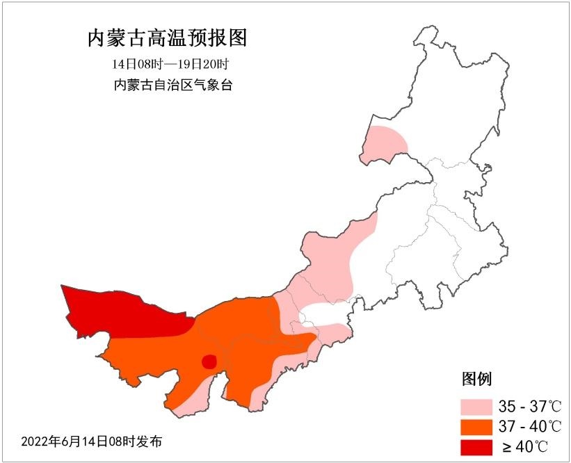 據(jù)內(nèi)蒙古氣象臺預(yù)計,6月16~20日連續(xù)5天,內(nèi)蒙古西部及中部偏西大部地區(qū)(阿拉善盟、烏海市、巴彥淖爾市、鄂爾多斯市、包頭市、呼和浩特市等大部地區(qū))將迎來今年首次大范圍35℃以上高溫天氣,其中,西部部分地區(qū)最高氣溫將達37℃及以上,局地超過40℃;20~21日阿拉善盟高溫將逐漸減弱消失,而35℃以上高溫天氣向錫林郭勒盟西部延伸。