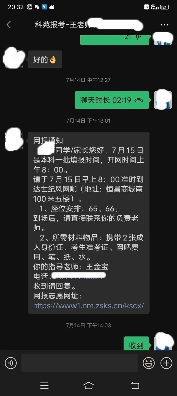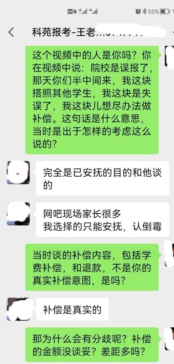據(jù)樊女士介紹,負(fù)責(zé)給小安報(bào)志愿的是科苑報(bào)考的王金寶老師,也是內(nèi)蒙古科苑信息科技有限公司的股東之一。樊女士提供的視頻顯示,這名老師在網(wǎng)報(bào)志愿現(xiàn)場回復(fù)樊女士:“院校就是誤報(bào)了,因?yàn)槟翘炷銈兪前胫虚g來,還有其他學(xué)生,搭照學(xué)生,我這塊兒就失誤了,我這塊兒想盡辦法做補(bǔ)償?!比欢?,樊女士反映,那天以后,這名老師開始反口,不承認(rèn)誤報(bào),也不愿意按照當(dāng)天商定的補(bǔ)償方案執(zhí)行。