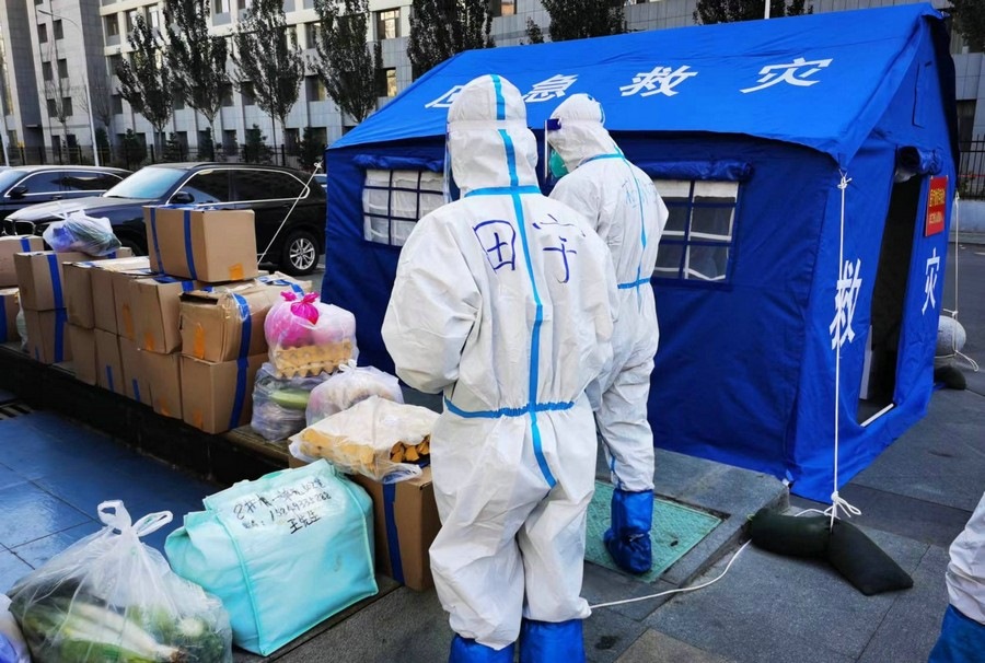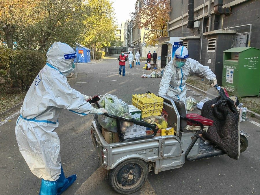 即使單元出現(xiàn)陽(yáng)性病例,田宇依舊穿著防護(hù)服,佩戴好口罩,第一時(shí)間將物資運(yùn)送到位。有時(shí)物資集中配送,田宇需要往返多次搬運(yùn)大量的物資。有時(shí)鄰居填錯(cuò)地址,還需要到別的居民樓幫忙找尋。但她從未有過(guò)一句怨言,面對(duì)鄰居們的感謝和贊揚(yáng),她總是憨厚地和大家說(shuō)“不要客氣”。當(dāng)鄰居們因?yàn)樾^(qū)的封控管理或物資短缺產(chǎn)生焦慮或不滿(mǎn)時(shí),她也會(huì)在第一時(shí)間解釋說(shuō)明,疏導(dǎo)大家的情緒。