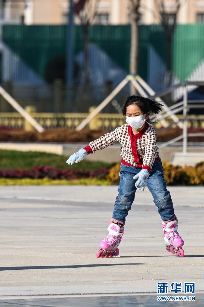 11月17日,小朋友在呼和浩特市新華廣場練習輪滑。新華社記者 王澤聰 攝