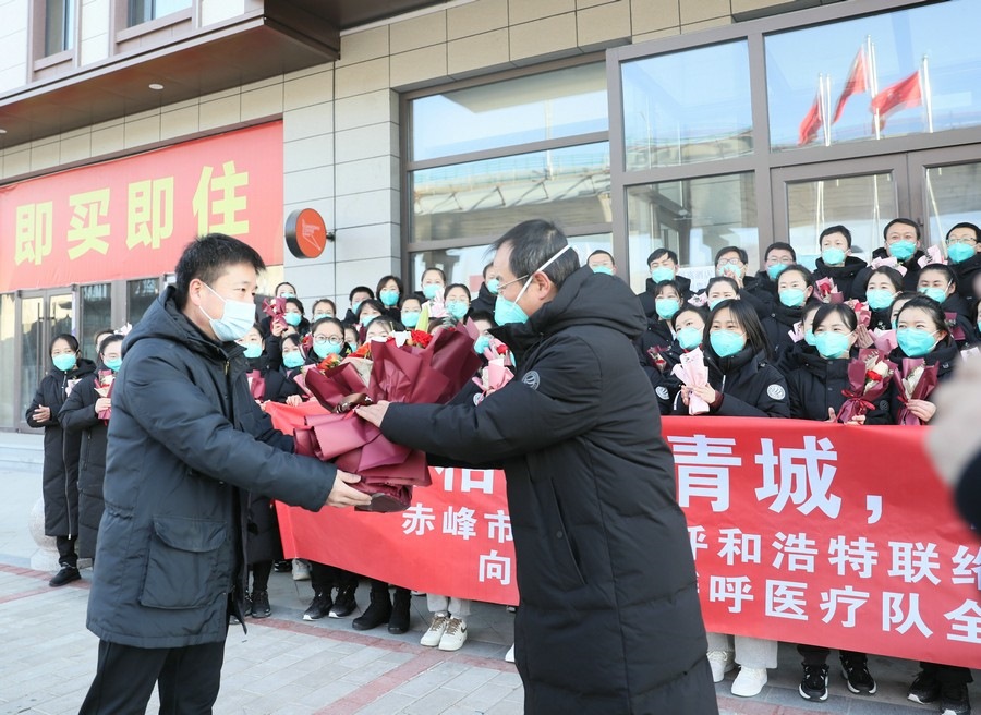 新華融媒、北疆新聞網(wǎng)消息(記者 張楊)“自呼和浩特疫情發(fā)生以來,50多個(gè)晝夜,白衣天使們逆行參戰(zhàn),奮戰(zhàn)在抗疫第一線,為呼和浩特保衛(wèi)戰(zhàn)貢獻(xiàn)了自己的力量,體現(xiàn)了白衣天使的責(zé)任和擔(dān)當(dāng),更展現(xiàn)了赤峰人奮勇拼搏的精神,圓滿完成了援呼醫(yī)療各項(xiàng)任務(wù),沒有辜負(fù)家鄉(xiāng)人民的重托,大家辛苦啦!”12月5日,在赤峰援呼普通病區(qū)醫(yī)療隊(duì)圓滿完成各項(xiàng)任務(wù),即將凱旋之際,赤峰市人民政府駐呼和浩特聯(lián)絡(luò)處和內(nèi)蒙古赤峰商會,共同到醫(yī)療隊(duì)駐地看望醫(yī)療隊(duì)員。赤峰市人民政府駐呼和浩特聯(lián)絡(luò)處副主任李子輝,代表駐呼聯(lián)絡(luò)處和內(nèi)蒙古赤峰商會在呼和浩特地區(qū)鄉(xiāng)友,向援呼醫(yī)療隊(duì)領(lǐng)隊(duì)羅俊祥等醫(yī)護(hù)人員獻(xiàn)上鮮花和對家鄉(xiāng)同胞的親切問候。