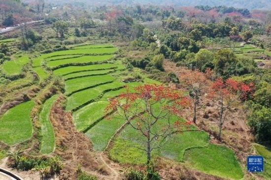 這是在海南昌江拍攝的梯田與木棉花(2月17日攝,無人機照片)。