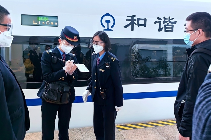 云縣站工作人員引導醫(yī)務人員進入站臺乘坐動車。中國鐵路昆明局集團有限公司供圖