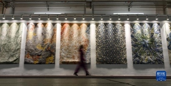 2月21日,在西寧市圣源地毯集團有限公司生產車間,一名操作工走過藏毯展示區(qū)。
