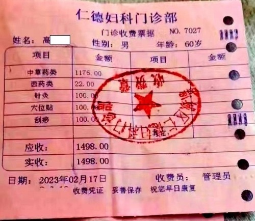 高先生被說動了,在王女士的陪同下來到了這名男子口中的“仁德醫(yī)院”。進去以后,發(fā)現(xiàn)醫(yī)院的名字叫“仁德婦科門診”。醫(yī)生確實如男子所說的那樣,告訴高先生不用做手術(shù),給開了1498元的中藥和中醫(yī)治療項目(如圖)。