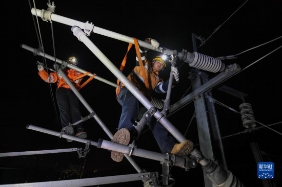 2月23日,綜合維修工在滬寧城際高鐵南京站至仙林站區(qū)間對(duì)接觸網(wǎng)進(jìn)行檢修維護(hù)。