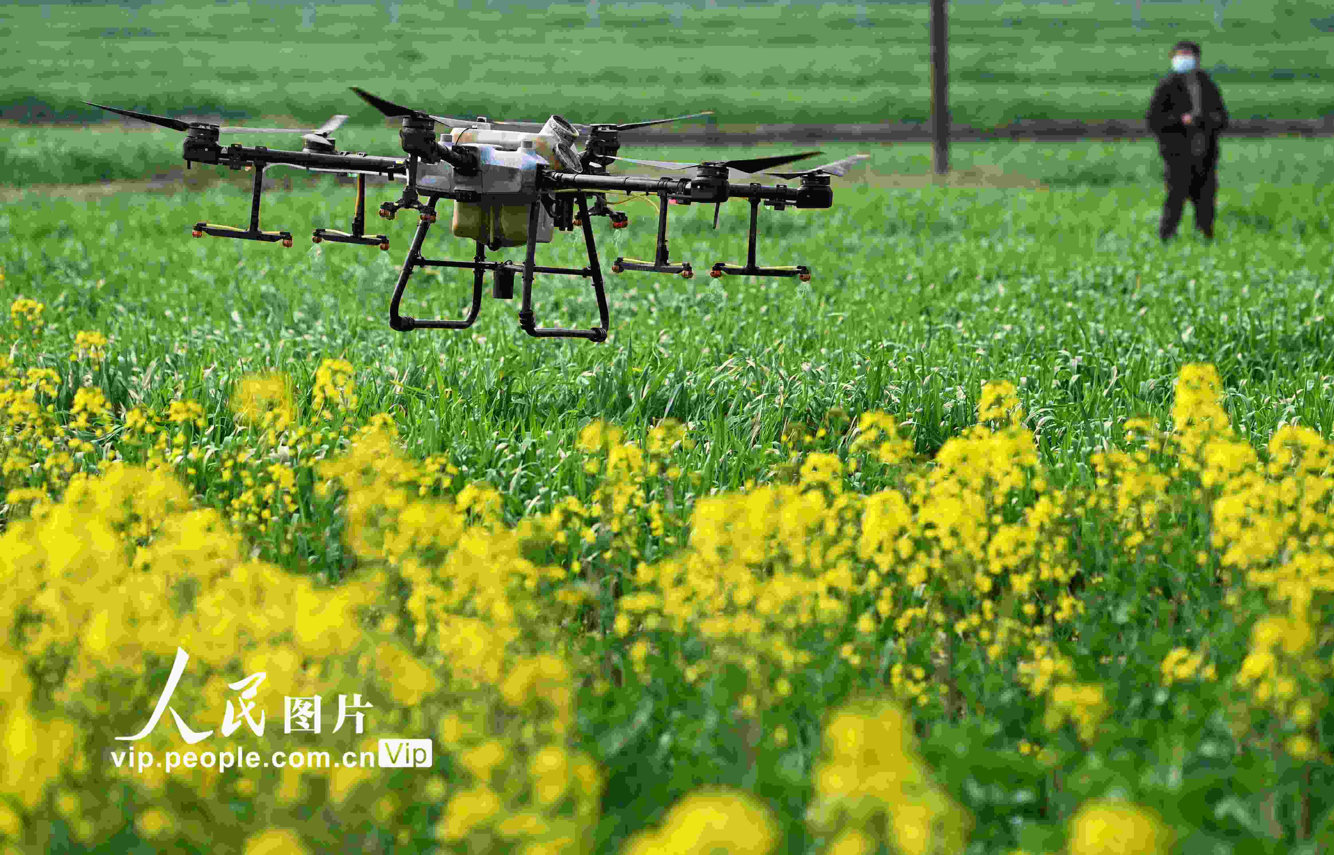 2023年2月25日,四川省南充市蓬安縣睦壩鎮(zhèn)武勝村,工作人員操控植保無人機在麥田噴灑農(nóng)藥。劉永紅攝(人民圖片網(wǎng))