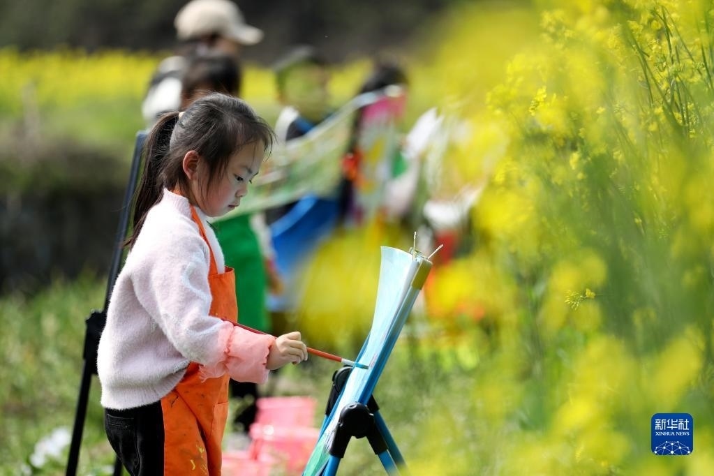 2月28日,在湖南省資興市唐洞街道高碼村,小朋友在油菜花田旁畫畫。