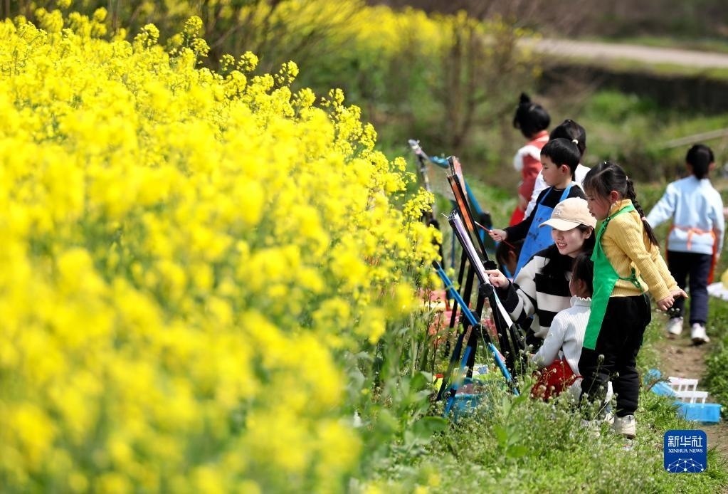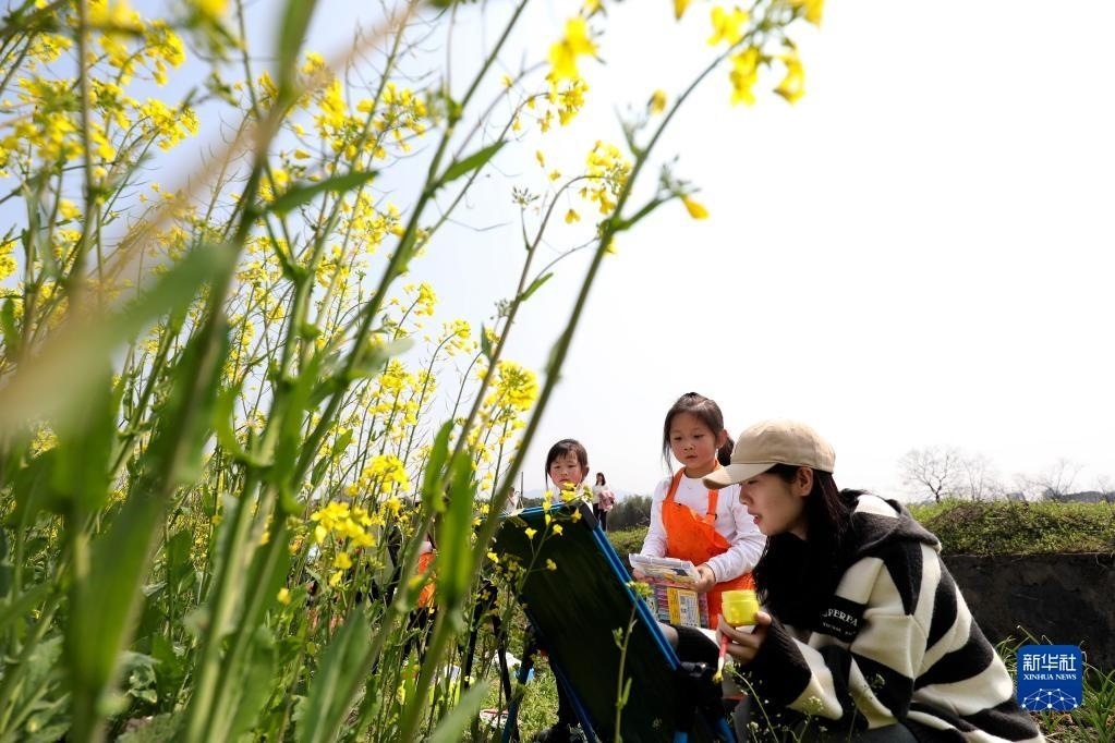 2月28日,在湖南省資興市唐洞街道高碼村,老師指導(dǎo)小朋友在油菜花田旁畫畫。