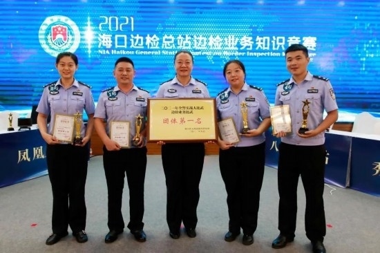 圖為2021年,王東玉(左一)和 同事參加全省邊檢業(yè)務(wù)崗位技能競(jìng)賽比武。