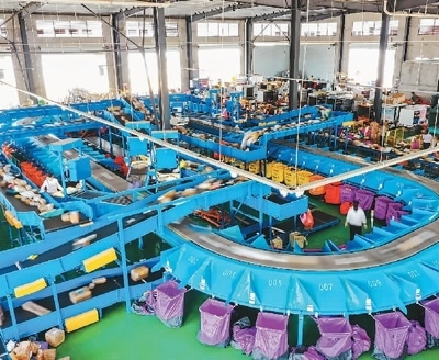 湖南省永州市藍山縣創(chuàng)品國際智慧物流園藍山星河物流科技有限公司的員工在智能分揀作業(yè)線上工作。 彭 華攝(人民圖片)