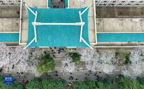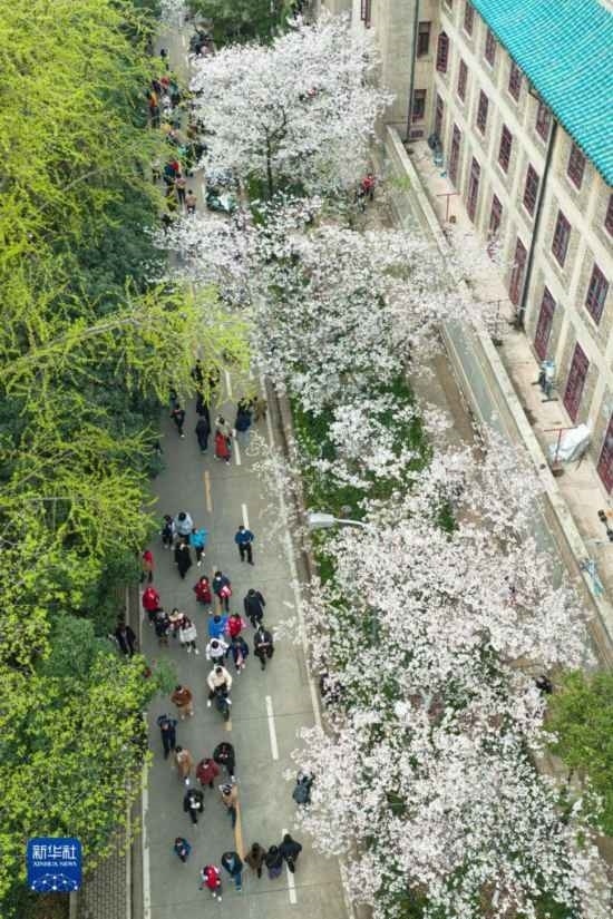 3月18日,來(lái)自各地的抗疫醫(yī)護(hù)人員及家屬在武漢大學(xué)校園賞櫻(無(wú)人機(jī)照片)。