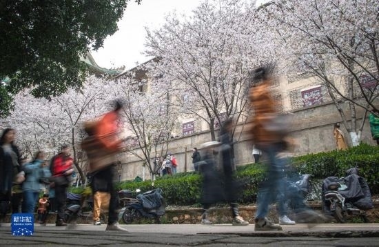 3月18日,來(lái)自各地的抗疫醫(yī)護(hù)人員及家屬在武漢大學(xué)校園賞櫻。
