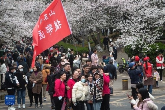 當(dāng)日,武漢大學(xué)舉行抗疫醫(yī)護(hù)賞櫻專場(chǎng)。珞珈山下,來(lái)自全國(guó)各地的1.6萬(wàn)余名抗疫醫(yī)護(hù)人員及家屬赴約賞櫻。