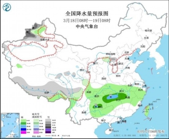 全國降水量預(yù)報(bào)圖(3月17日08時(shí)-18日08時(shí))