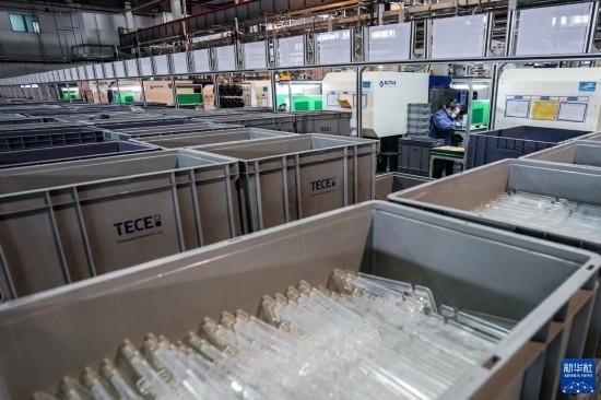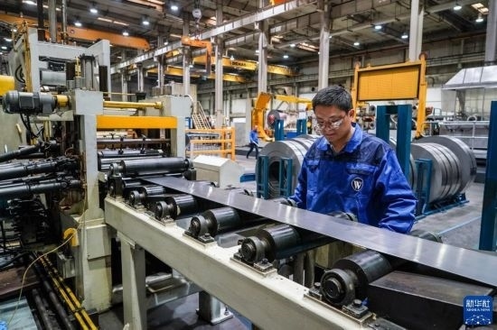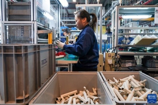 工人在位于太倉(cāng)市高新區(qū)的帝希潔具系統(tǒng)(蘇州)有限公司生產(chǎn)車(chē)間內(nèi)進(jìn)行加工作業(yè)(3月16日攝)。