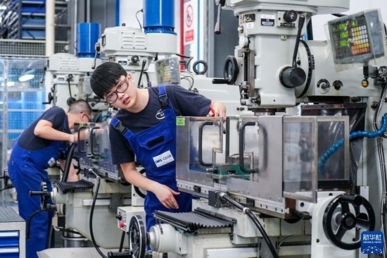 工人在位于太倉(cāng)市高新區(qū)的億邁齒輪(太倉(cāng))有限公司生產(chǎn)車(chē)間內(nèi)進(jìn)行加工作業(yè)(3月14日攝)。