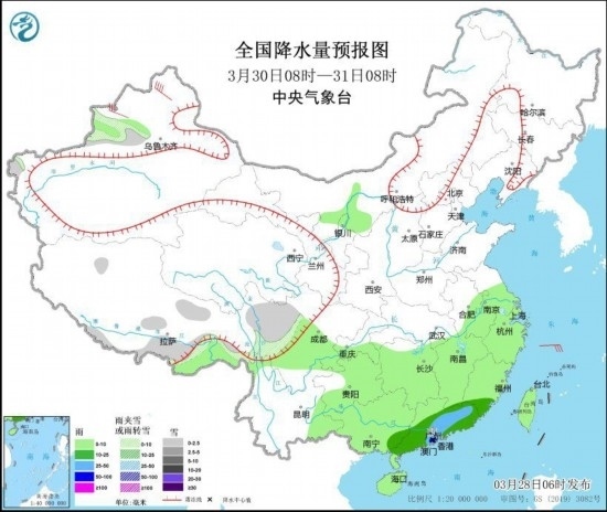 圖3 全國降水量預(yù)報圖(3月30日08時-31日08時)