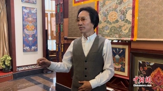 非遺傳承人拉孟長期致力于免費(fèi)培養(yǎng)唐卡傳承人。圖為拉孟介紹唐卡文化。中新網(wǎng)記者 劉湃 攝