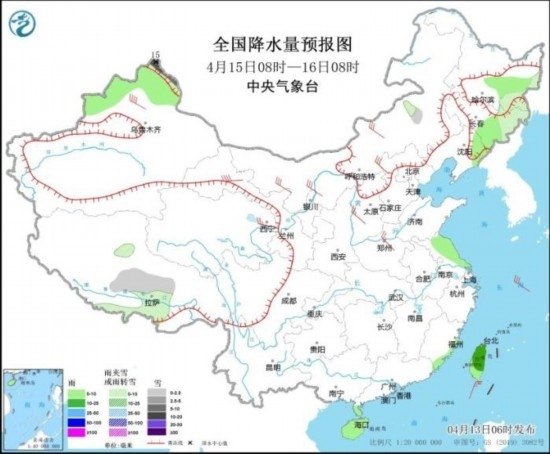 4月15日08時(shí)至16日08時(shí),黑龍江東南部、吉林東部、新疆北疆北部、西藏南部等地部分地區(qū)有小到中雪或雨夾雪,其中,新疆北疆北部局地有大到暴雪(10~15毫米)。黑龍江東部、吉林東部、遼寧東部、新疆北部、江淮東部、海南島、臺(tái)灣島等地部分地區(qū)有小雨,其中,臺(tái)灣島部分地區(qū)有中雨。內(nèi)蒙古中西部、西北地區(qū)中東部、華北大部等地部分地區(qū)有4~6級風(fēng),其中,新疆沿天山地區(qū)、甘肅河西等地部分地區(qū)有6~7級風(fēng)。東海北部海域?qū)⒂?~7級、陣風(fēng)8級的西北風(fēng),臺(tái)灣以東洋面將有5~7級、陣風(fēng)8級的東北風(fēng)。