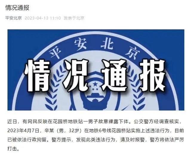 ·北京警方通報(bào)男子在地鐵站故意裸露下體:已依法行政拘留。