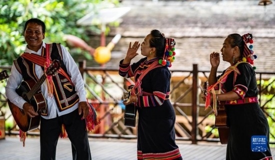 在云南省普洱市瀾滄拉祜族自治縣老達保村,致富帶頭人、拉祜族村民李娜倮(中)帶領村民演出(2022年7月5日攝)。