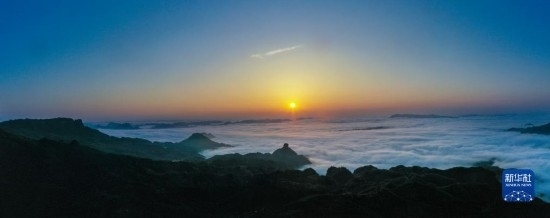 這是4月19日拍攝的金佛山日出時(shí)分的云海景觀(無人機(jī)拼接照片)。