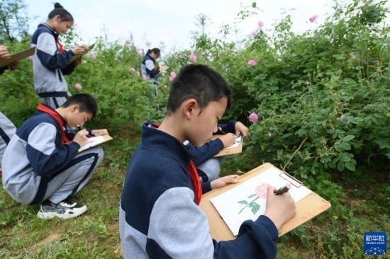 4月20日,埭溪鎮(zhèn)上強(qiáng)中學(xué)的學(xué)生在玫瑰莊園寫生。
