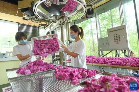 4月20日,工作人員處理剛采摘的玫瑰花,準(zhǔn)備烘干。