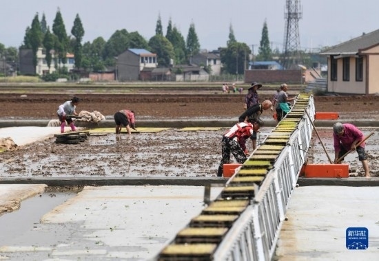 4月20日,在彭山區(qū)公義鎮(zhèn)的數(shù)智水稻示范基地,工人在秧盤智能傳輸帶上轉(zhuǎn)運(yùn)育秧盤。