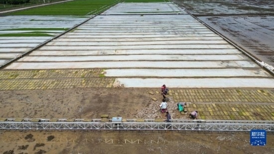 4月20日,在彭山區(qū)公義鎮(zhèn),數(shù)智水稻示范基地內(nèi)的工人在田里育秧(無(wú)人機(jī)照片)。