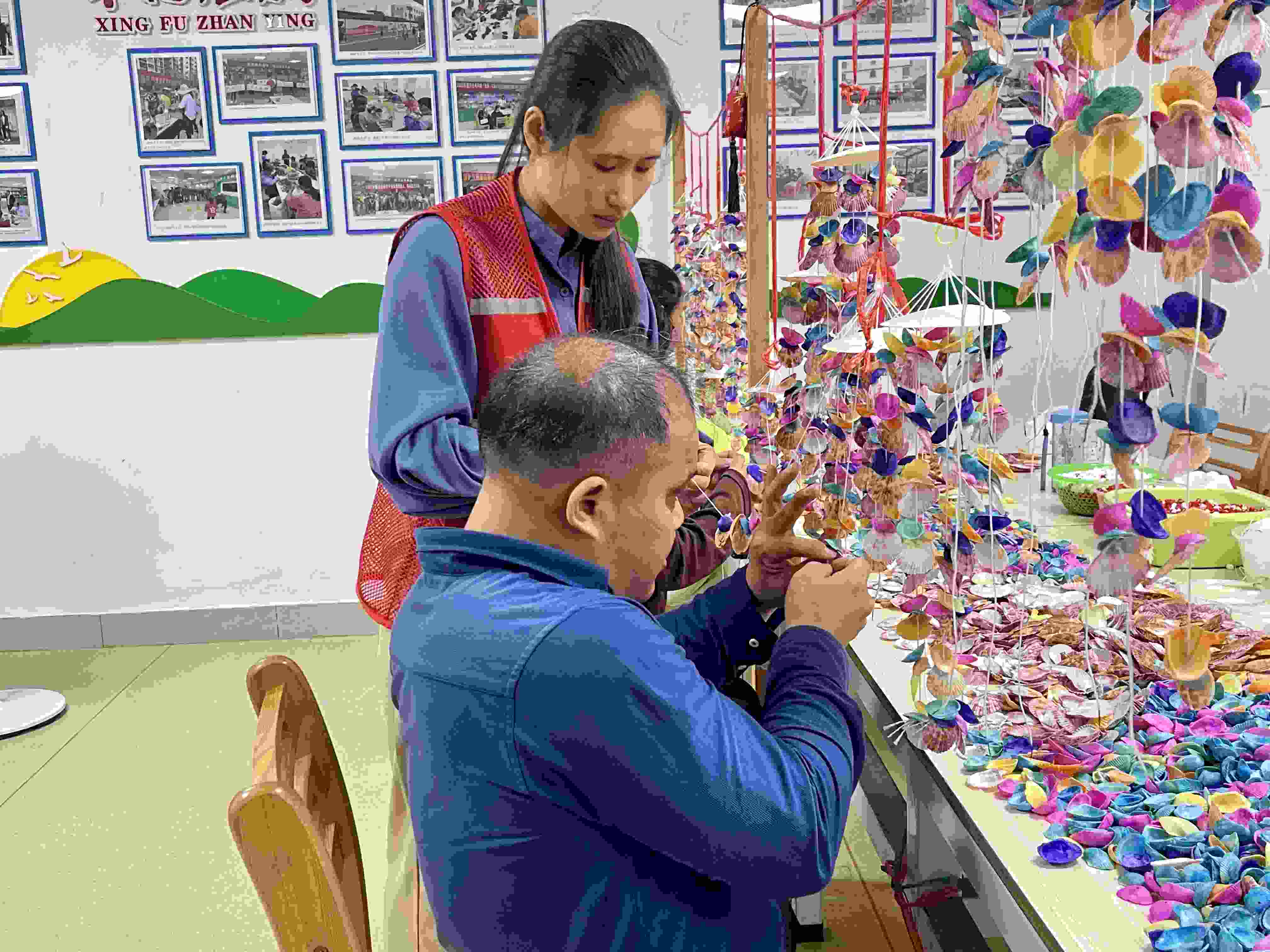 在北海市銀海區(qū)僑港殘疾人輔助性就業(yè)及日間照料中心(以下簡稱“中心”),工作人員在指導(dǎo)殘疾人串貝殼。這里已經(jīng)安置了11名殘疾人與企業(yè)簽訂勞動合同,人均年收入在2萬元左右。
