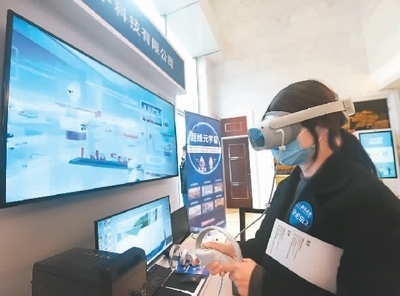 3月29日,在河北省雄安新區(qū)生態(tài)環(huán)境監(jiān)測(cè)中心內(nèi),環(huán)境監(jiān)測(cè)員借助VR(虛擬現(xiàn)實(shí))設(shè)備輔助開展工作。本報(bào)記者 史自強(qiáng)攝