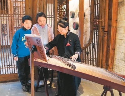 4月9日,在安徽省黟縣石亭村的民宿“拾庭畫驛”內(nèi),民宿管家在為小朋友演奏傳統(tǒng)樂(lè)器。新華社記者 馬 寧攝