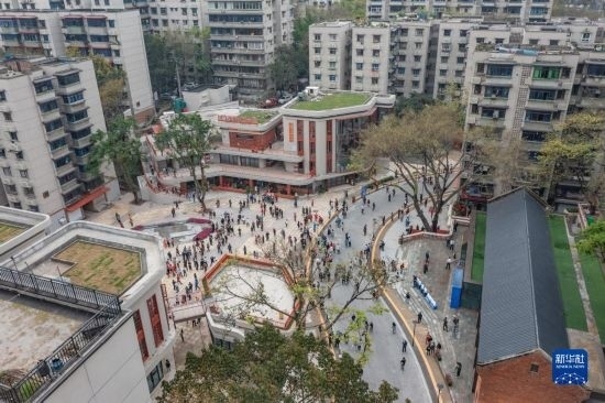 4月28日,在竣工亮相的重慶市九龍坡區(qū)謝家灣街道民主村片區(qū)城市更新項目(一期),人們在一處公共空間休息(無人機照片)。