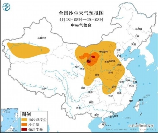 受冷空氣大風(fēng)影響,預(yù)計4月28日08時至29日08時,新疆南部、內(nèi)蒙古中西部、甘肅北部和東部、寧夏、陜西、四川盆地北部、山西、河北西部、河南、山東中西部、湖北、湖南北部、安徽北部、江蘇西北部等地的部分地區(qū)有揚沙或浮塵天氣,其中,內(nèi)蒙古西南部、甘肅東北部、寧夏中北部、陜西西北部等地的部分地區(qū)有沙塵暴,局地有強沙塵暴。中央氣象臺4月28日06時發(fā)布沙塵暴藍色預(yù)警。
