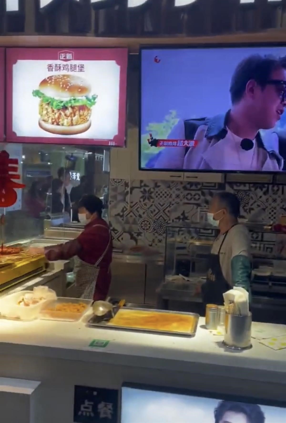 視頻中店內(nèi)宣傳廣告圖顯示,香酥雞腿堡除了兩片面包外,中間夾有蔬菜和雞肉,與顧客購買到手的漢堡相差甚遠(yuǎn)。
