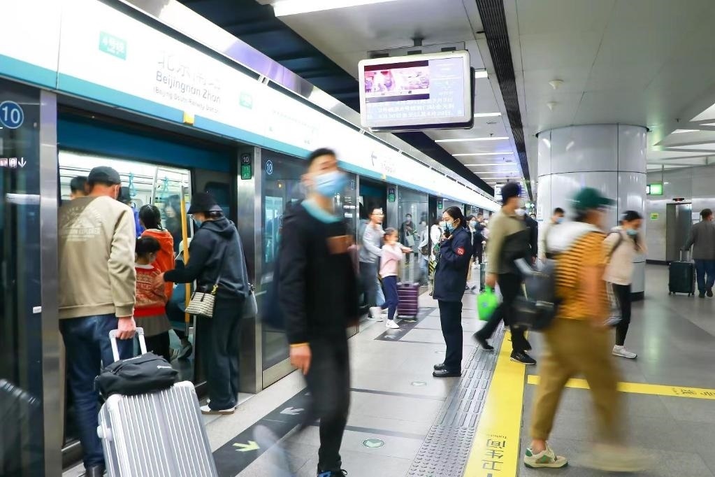 “大家進站時要小心腳下的行李箱。”3日14時,隨著大量鐵路旅客抵達北京南站,地鐵4號線北京南站也開始變得忙碌。站廳內(nèi),工作人員在自動售票機、閘機前引導(dǎo)旅客快速購票進站;站臺上,軌道列車準時抵達,乘客快速流動疏散。