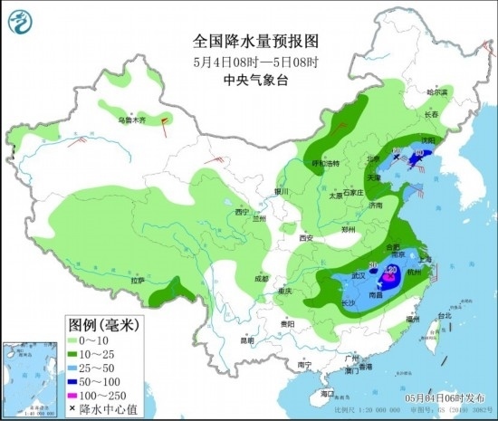 5月4日08時(shí)至5日08時(shí),湖北南部和東部、安徽南部、湖南東北部、江西中北部、浙江西部、江蘇南部以及山東半島、遼寧南部、河北東部等地部分地區(qū)有大到暴雨,其中,安徽南部、江西北部等地部分地區(qū)有大暴雨(100~120毫米)。上述部分地區(qū)伴有短時(shí)強(qiáng)降水(最大小時(shí)降雨量20~40毫米,局地可超過(guò)50毫米),局地有雷暴大風(fēng)等強(qiáng)對(duì)流天氣。內(nèi)蒙古中部、黑龍江東北部、新疆南疆盆地、甘肅河西、山東半島等地部分地區(qū)有4~6級(jí)風(fēng),其中,新疆東部部分地區(qū)有8~9級(jí)風(fēng)。渤海、渤海海峽、黃海大部、東海北部海域?qū)⒂?~8級(jí)、陣風(fēng)9~10級(jí)的大風(fēng)。