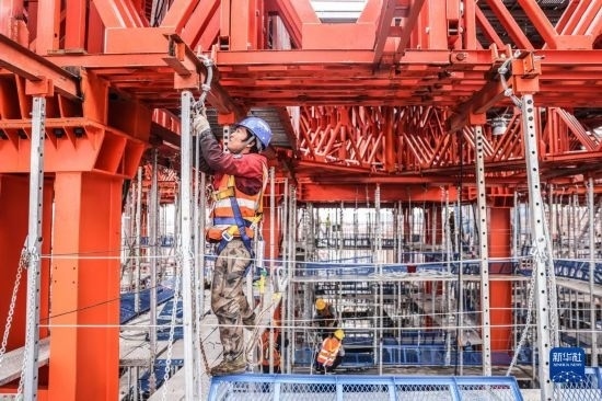 5月3日,在長沙西站建設(shè)工地,工人做混凝土澆筑前準(zhǔn)備(無人機(jī)照片)。