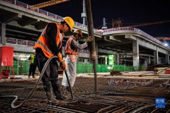 5月3日,在長沙西站建設(shè)工地,工人進(jìn)行混凝土澆筑作業(yè)。