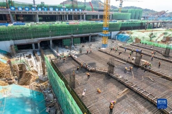 5月3日,在長沙西站建設(shè)工地,工人做混凝土澆筑前準(zhǔn)備。