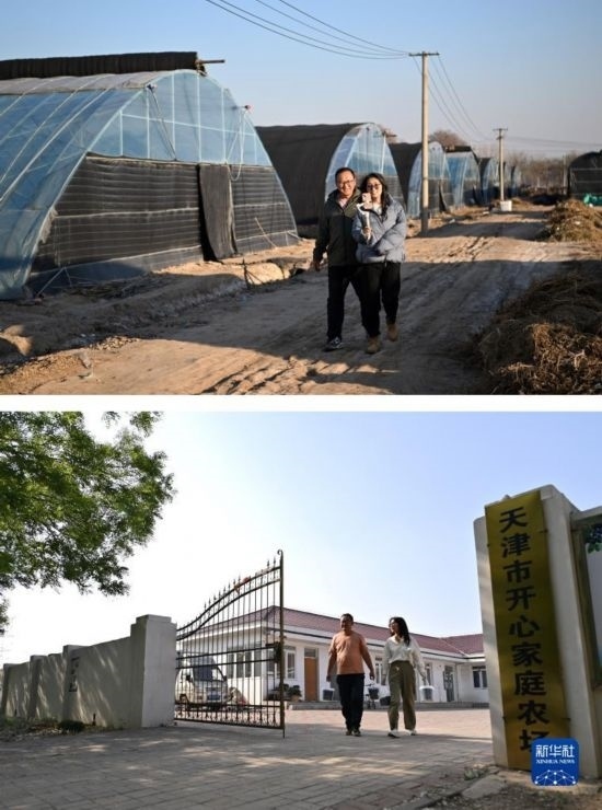 拼版照片:上圖為呂欣和丈夫馮愛(ài)喜通過(guò)直播介紹自家種植藍(lán)莓的大棚(2022年12月6日攝);下圖為呂欣和丈夫馮愛(ài)喜一起走出家庭農(nóng)場(chǎng)(5月3日攝)。