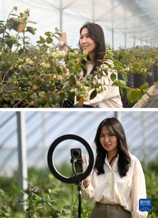 拼版照片:上圖為呂欣在大棚里用手機(jī)拍攝介紹處在花期的藍(lán)莓(1月11日攝);下圖為呂欣在大棚里通過(guò)直播介紹已進(jìn)入采摘期的藍(lán)莓(5月3日攝)。